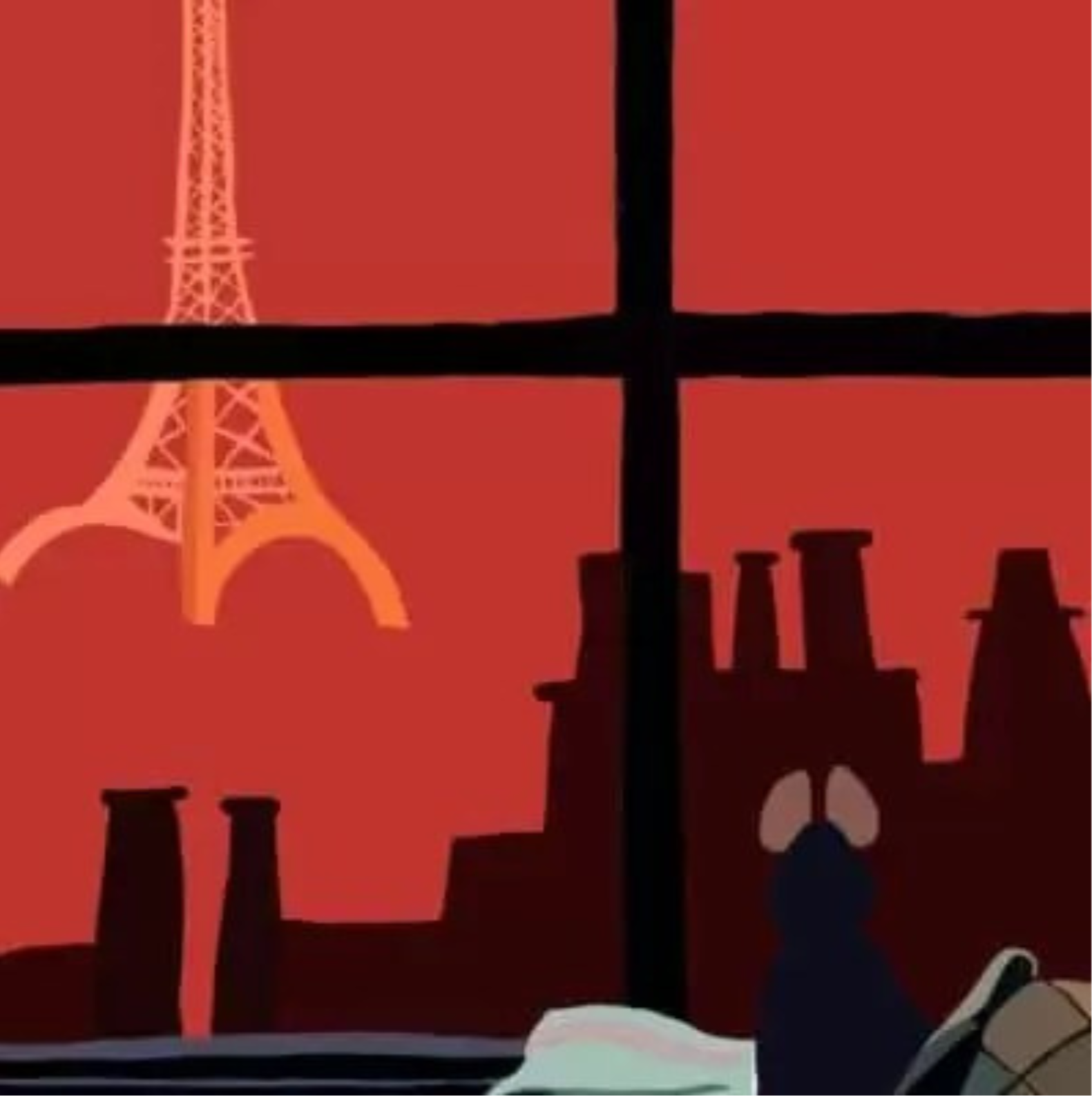 When Remy becomes lost he makes his way to the rooftops and in the distance see’s the famous Eiffel Tower. This is a pivitol scene in the movie as Remy’s dream’s become reality. Additionally, Remy is observed gazing at the Eiffel tower from Linguine’s picturesque apartment window near the end of the movie signifiying how far he has come yet his persective stays the same.